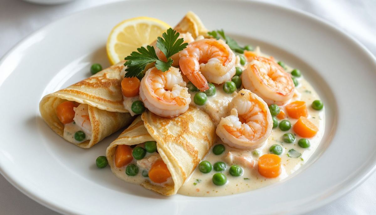 Знаете, что меня всегда спасает в ситуациях, когда хочется впечатлить, но нет времени на кулинарные подвиги? Обычные блины. Но не с вареньем, а в их «взрослом», элегантном воплощении. Этот рецепт — как маленькое путешествие на французское побережье. Он родился из воспоминания об отпуске, где в уличном кафе подали тончайшие блинчики с морепродуктами. Дома я долго искала тот баланс: чтобы начинка была сочной, но не мокрой, а блины — тонкими, но прочными. И нашла его в сочетании сливочно-овощной основы с белым вином и сочными креветками. Такие блины — это не Масленица, это совсем другая история. Они пахнут летом, морем и праздником. Их не страшно подать к приходу друзей с бутылкой белого вина. Или устроить себе особенный романтичный ужин в среду просто потому, что вы этого достойны. Готовятся они не так долго, как кажется, а результат выглядит так, будто вы провели на кухне полдня. ЧТО НАМ ПОНАДОБИТСЯ (гармония моря и огорода) Важно взять хорошие, некрупные креветки (королевские подойду