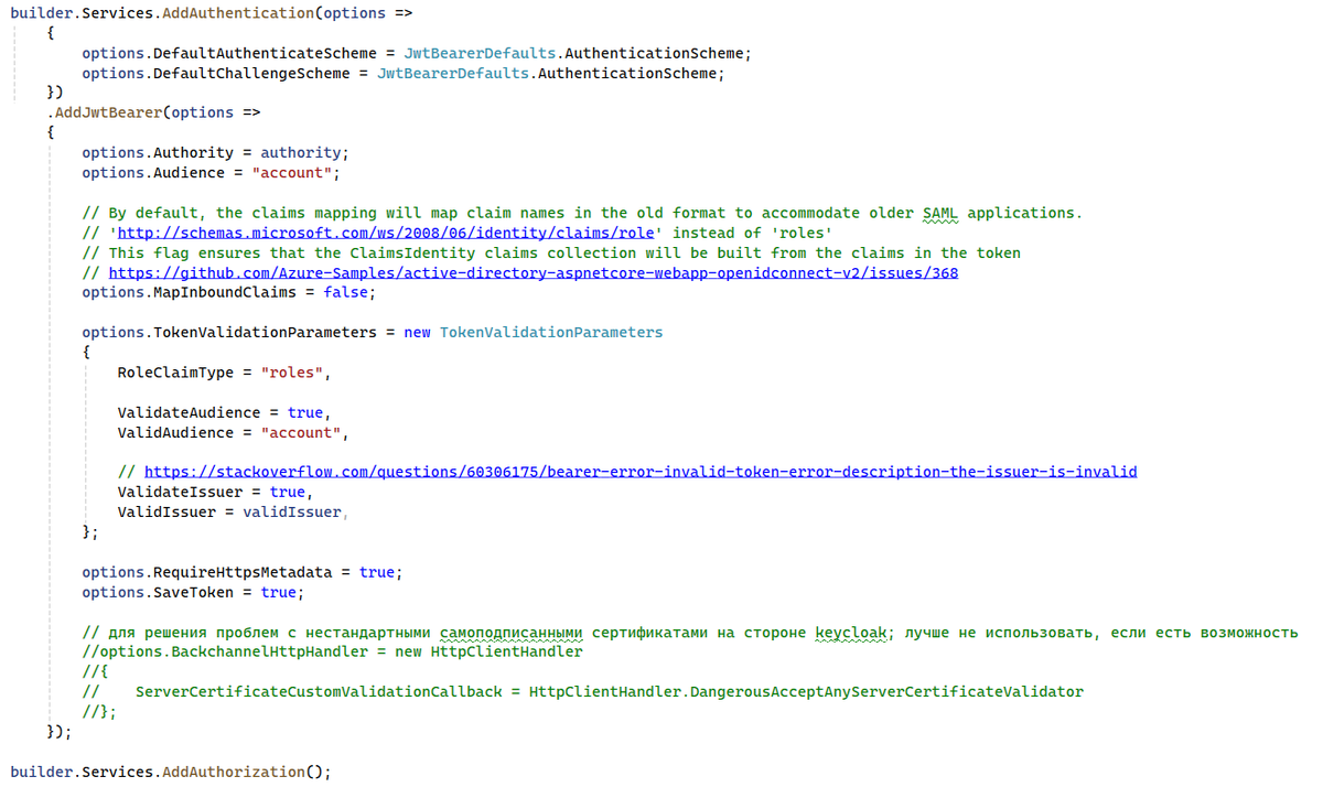 - MapInboundClaims = false - без этого клеймы нормально не отображаются на роли. Вроде как старая проблема. Точнее, есть вроде еще вариант - не включать эту опцию, а в RoleClaimType указать "http://schemas.microsoft.com/ws/2008/06/identity/claims/role". Есть у меня подозрение, что проблемы с клеймами возникли из-за того, что я там повозился в Keycloak с настройками, но я так и не разобрался, и разбираться не буду, потому что времени совсем нет на это.