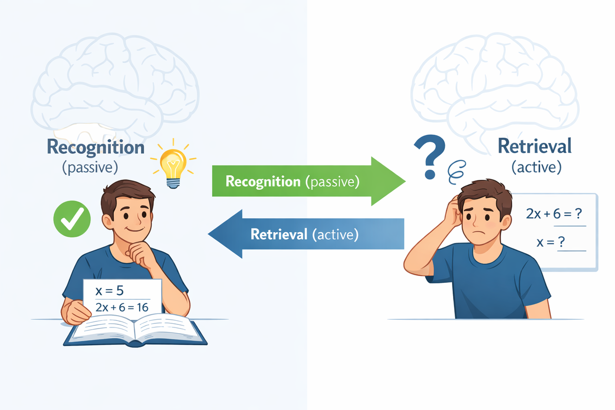 На самом деле происходит другое: мозг узнаёт знакомую структуру (паттерн), которую вы уже видели. Узнавание — это пассивная реакция. Она требует минимум усилий. Но узнавание — это не навык. Навык — это способность вызвать знание из памяти в новой, незнакомой ситуации, когда перед вами нет подсказки.
