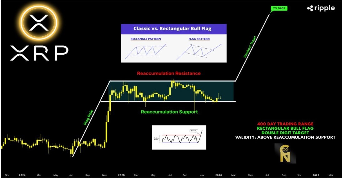 📈 Аналитик ChartNerd предполагает, что текущая стагнация XRP (~ $1.92 на текущий момент) является последней фазой перед историческим движением. После 400-дневной фазы прямоугольного накопления, XRP готовится к значительному росту. Если бычий флаг разрешится, цель может достигнуть $23, что представляет потенциальный рост более чем на 1000%. 📊 Ключевые моменты: - XRP находится в фазе накопления около 400 дней, формируя бычий флаг на макротаймфрейме. - Поддержка на уровне $1.8 и сопротивление на уровне $3.6 соблюдаются. - Проекция указывает на возможный рост до $23, что является наиболее агрессивным ралли за 7-8 лет. ⚠️ Риски: Прорыв ниже поддержки $1.8 может аннулировать бычий сценарий. Горизонт: Среднесрочный/Долгосрочный
