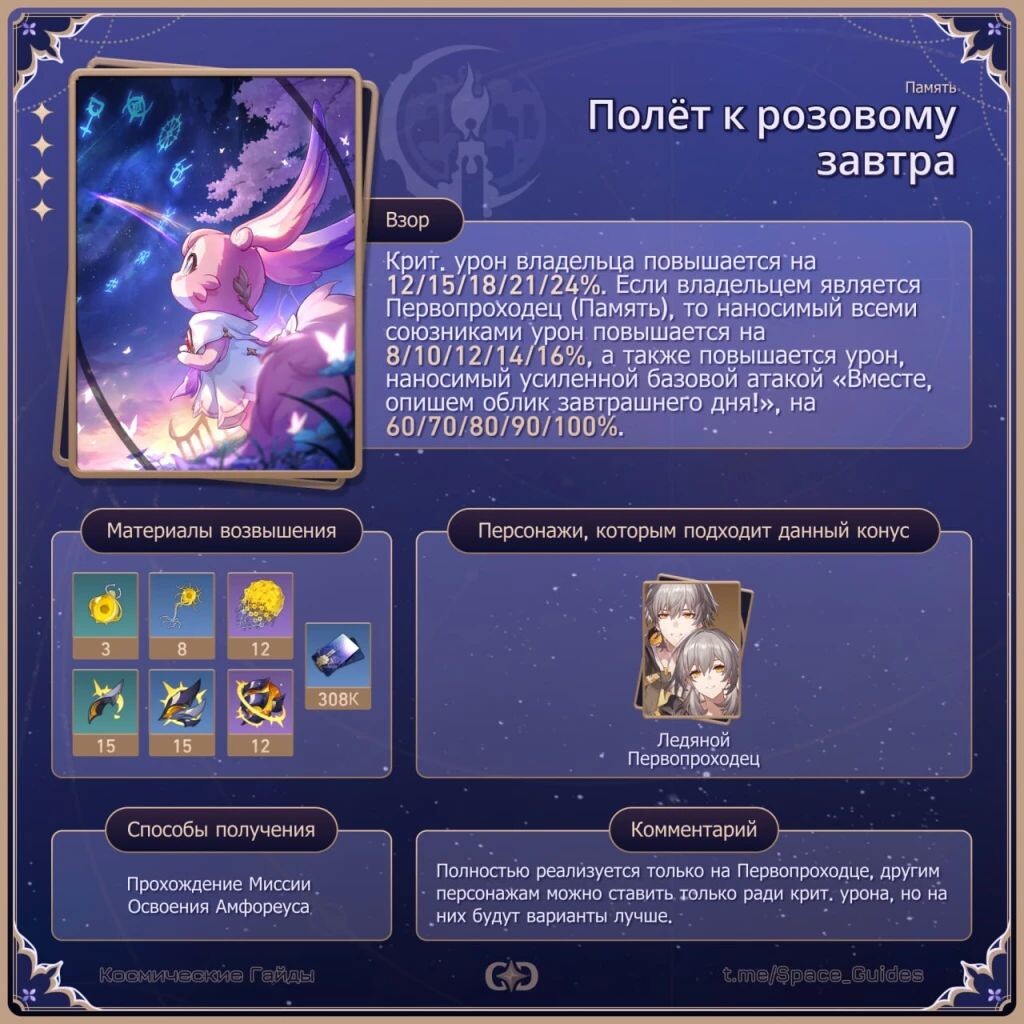 ㅤЭто новый конус, появившийся в версии 3.7. В этой статье вы узнаете кому он подходит и стоит ли его прокачивать. ㅤС подробным описанием и материалами прокачки Вы можете ознакомиться на картинке: ㅤПовышает крит. урон владельца на 12/15/18/21/24%. Если конус экипирован на Первопроходце Памяти, то также повышается урон, наносимый всеми союзниками, на 8/10/12/14/16% и урон усиленной базовой атаки «Вместе опишем облик завтрашнего дня!» также повышается на 60/70/80/90/100%. ㅤКонус «Полёт к розовому завтра» можно получить при прохождении Миссии Освоения версии 3.7. ㅤДругим персонажам Пути Памяти конус не подходит, но, в крайнем случае, можно надеть его ради повышения крит. урона, что нецелесообразно, если у вас есть и другие варианты. ㅤСтоит ли его прокачивать? Если у вас нет 5* замен, но вы активно пользуетесь Первопроходцем, то однозначно да. Этот конус является лучшим бесплатным вариантом для него и выполняет разностороннюю функцию. К тому же он бесплатный, поэтому проблем с его получение