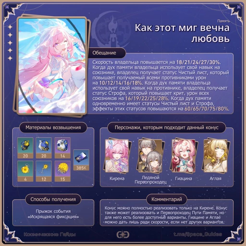 ㅤСветовой конус, добавленный в игру вместе с релизом Кирены в 3.7. Стоит ли его крутить и на сколько он незаменим для самой Кирены? Разберём эти вопросы в статье! ㅤ«Как этот миг вечна любовь» — сигнатурный Световой конус Кирены. ㅤС подробным описанием пассивного таланта и необходимыми материалами можно ознакомиться на картинке: ㅤКонус повышает скорость владельца на 18/21/24/27/30%. При использовании навыка духа памяти на союзнике, дух памяти получает статус Чистый лист, повышающий получаемый противниками урон на 10/12/14/16/18%. При использовании духом памяти навыка на противнике, дух памяти получает статус Строфа, который повышает крит. урон союзников на 16/19/22/25/28%. При одновременном наличии обоих статусов, их эффект повышается на 60/65/70/75/80%. ㅤКонус был доступен для получения в прыжке события «Искрящаяся фиксация», который длился всю версию 3.7. В будущем он также будет доступен к получению во время рерана персонажа. ㅤЭтот конус довольно полезен для саппортов Пути Памяти, но