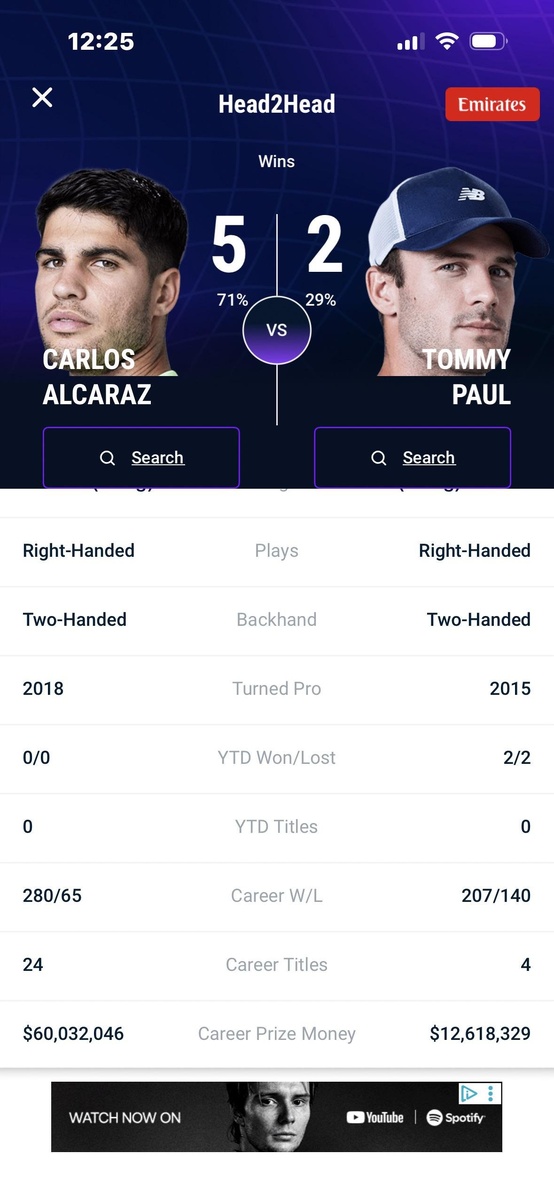 Алькарас и Пол сыграли почти одинаковое количество матчей: 345 против 347. Head2Head Победы: 9 : 2 ALCARAZ vs PAUL Правша / Правша Двуручный бэкхенд / Двуручный бэкхенд 2018 / 2015 0/0 / 2/2 0 / 0 280/65 / 207/140 24 / 4 $60,032,046 / $12,618,329 Подпишись на Эйс и точка