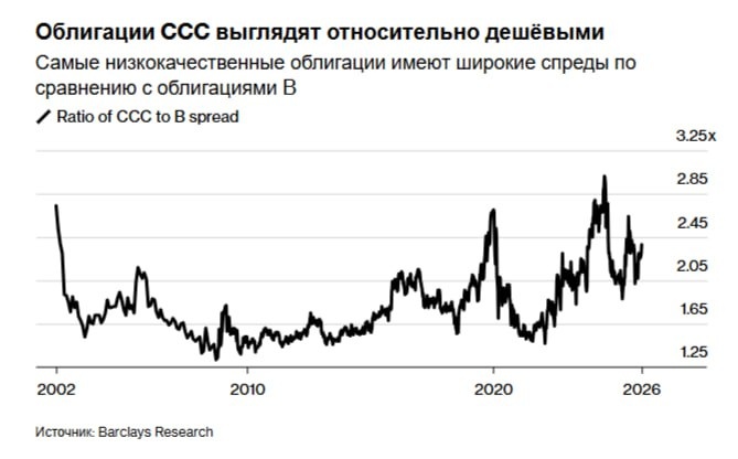 📌 Основные события: Рост цен на облигации CCC: Облигации с рейтингом CCC выросли в цене на 1,15% в пересчёте на общую доходность. Это свидетельствует о том, что инвесторы готовы принимать на себя больший риск в поисках доходности. Снижение доходности казначейских облигаций: Доходность казначейских облигаций снизилась примерно на 0,2%. Это может быть связано с общим снижением процентных ставок и увеличением спроса на более безопасные активы. Причины роста: Поиск выгодных предложений и исторически низкие цены на облигации CCC. Инвесторы ищут возможности для получения более высокой доходности, что делает облигации CCC привлекательными. 📊 Контекст: Рынок CCC: Облигации CCC составляют около 12% рыночной стоимости высокодоходного индекса, но при этом на них приходится около четверти спредов индекса. Это означает, что хотя их доля на рынке относительно невелика, они оказывают значительное влияние на общую доходность. Инвесторы: Инвесторы проявляют особый интерес к низкокачественным об
