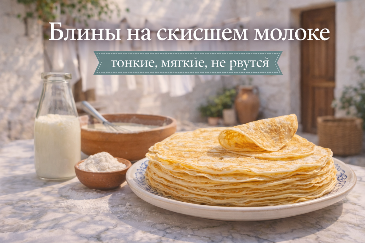 Почему так: сода реагирует с кислотой скисшего молока — появляются мелкие пузырьки, блины становятся нежнее.