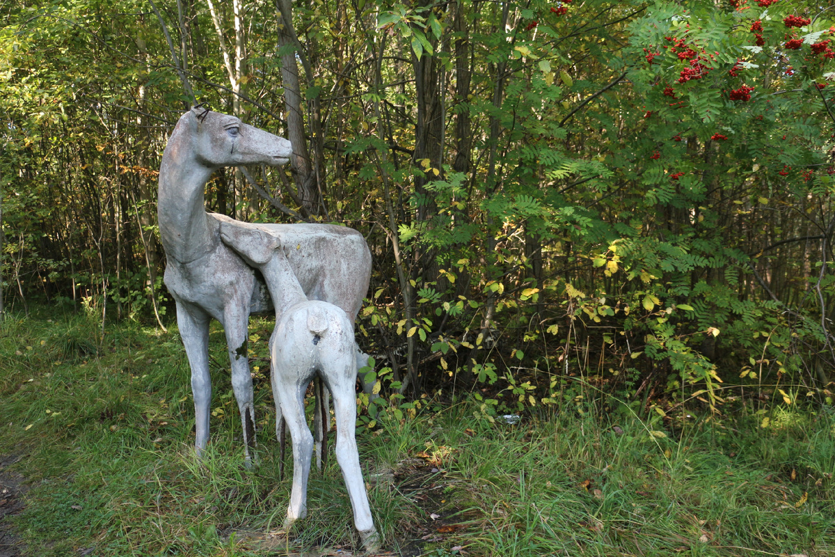 Неожиданно в одном из дворов, рядом с детским садом, замечаем в лесочке, по всей вероятности бывшем когда-то парком, вот такое чудо - частично разрушенную парковую скульптуру, изображающую оленуху с оленёнком.