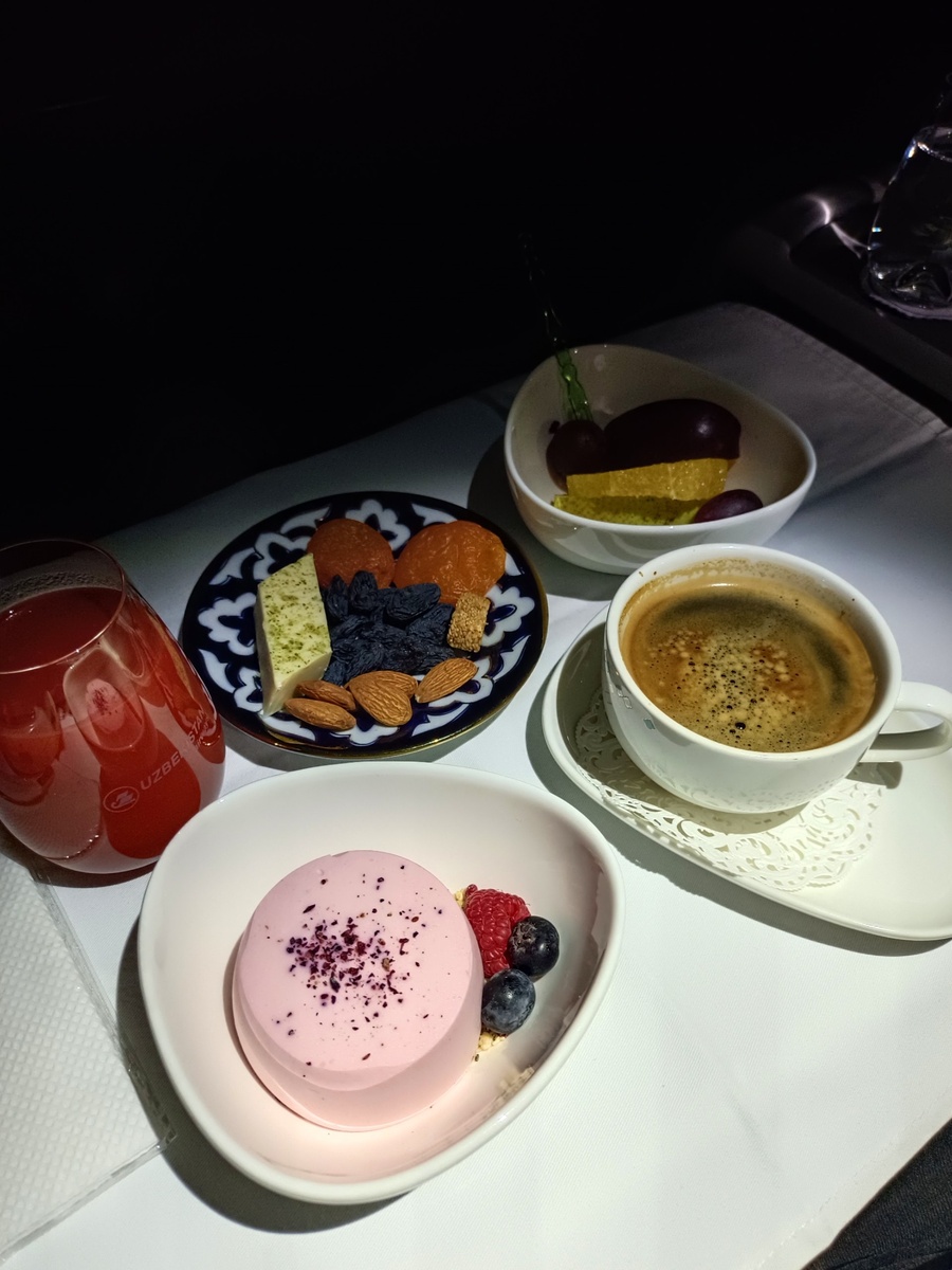 Томатный сок, привести организм плавно в чувства. Нежное суфле с ягодами голубики да малины свежей. Ароматный кофе. Ломтики груши, яблока, апельсина, виноградники. Халву, кознак и кишмиш слопал, а вот курагу на всякий случай взял с собой. А то вдруг расслабит, а тут самолёт на посадку идёт 😏
