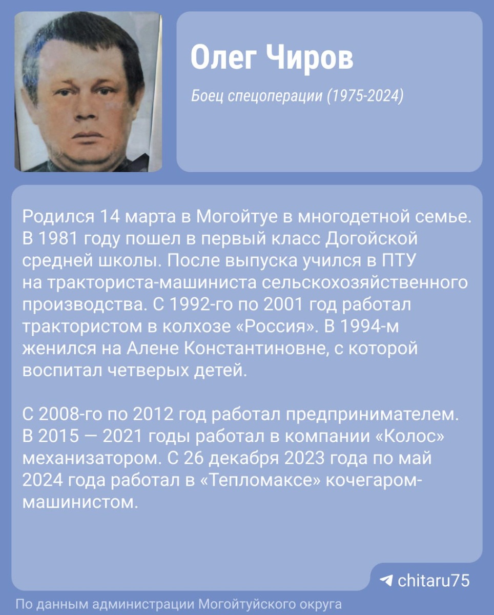 В тг-канале администрации Могойтуйского округа пишут, что Олег Чиров подписал контракт с Минобороны 4 июля 2024 года. Погиб 24 июля при исполнении воинского долга. Фото: тг-канал администрации Могойтуйского округа 📌📌📌📌📌 «Чита.Ру» в MAX