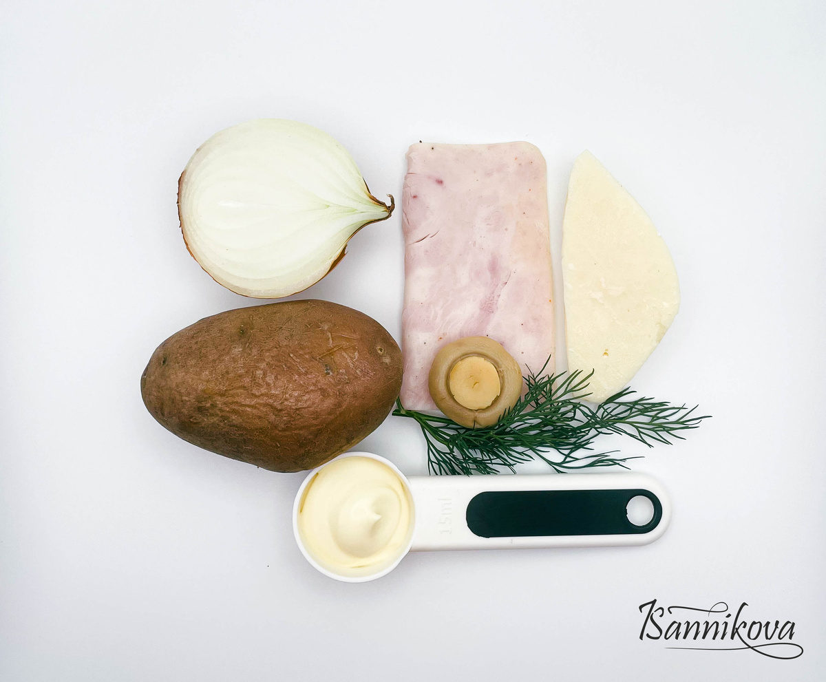 Рецепт пошагового приготовления салата "Полянка в домашних условиях с фотографиями Ингредиенты: 1. сыр натереть на мелкой терке, картофель на крупной терке, маринованные шампиньоны и ветчину нарезать соломкой На заметку: маринованные шампиньоны можно заменить на свежие, но обжарить, ветчину на мясо/птицу. 2. лук нарезать перьями, затем на среднем огне обжарить на растительном масле, примерно 8-10 минут (у кого-то времени может уйти больше), чем дольше жарить, тем самым он приобретет больше карамельного вкуса, посолить, можно поперчить 3. первый слой — картофель, смазать майонезом 4. второй слой — грибы 5. третий слой — обжаренный лук 6. четвертый слой — ветчина 7. пятый слой — сыр, смазать майонезом 8. сверху выложить грибы 9. добавить укроп, затем накрыть крышкой/пищевой пленкой, убрать в холодильник на 2-3 часа или на ночь 10. салат «Полянка» готов