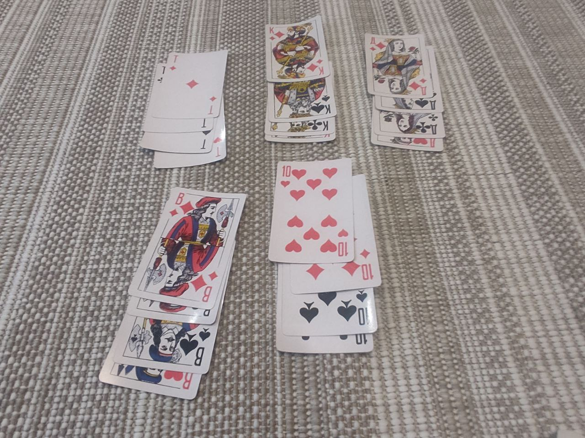 Всем привет! В этой статье я расскажу, как играть в классического упрощённого дурака. Эту игру я сам придумал, она короче и в ней меньше карт, так что идеальна для новичков. Для упрощённого дурака нужно всего 20 карт, от 10 до туза (такой же набор, как в «козле»). Карты тщательно перемешиваются любым способом. Затем каждому игроку раздаётся по 4 карты. После раздачи вытяните одну карту сверху и положите её вниз колоды рубашкой вниз, так чтобы всем игрокам было видно масть – это козырь. Совет: не раздавайте сначала первому, а потом второму. Раздавайте сначала одну карту первому, потом одну второму, и так, пока не будет у каждого по 4 карты. Сначала идёт 10, потом валет, потом дама, потом король, потом туз. Мастей всего 4: креста ♣, бубна ♦, пика ♠ и черва ♥. Первым ходит тот, у кого меньший козырь. Если у обоих игроков нет козырей, то тогда у кого меньшая карта того же цвета, но другой масти. Пример: козырь черва ♥. У игроков его нету, но есть бубна ♦. У первого игрока есть 10 бубна ♦,