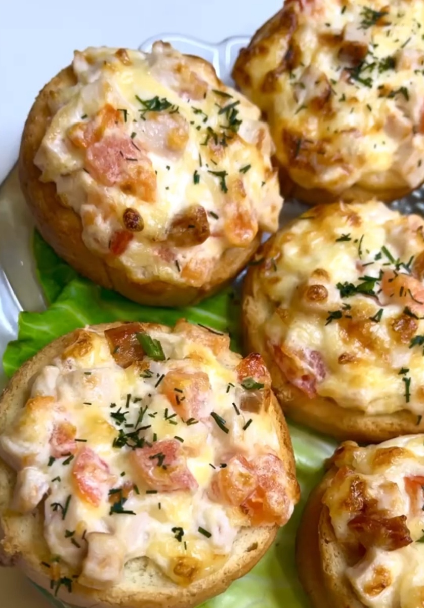 Батон нарезать на кружки. Для начинки все ингредиенты нужно нарезать, сыр натереть на крупной тёрке, добавить майонези все перемешать. Нанести начинку на каждый ломтик батона.И в духовку на градусов минут на 10. Либо в аэрогриле на режиме пицца 180гр 5-7 минут.