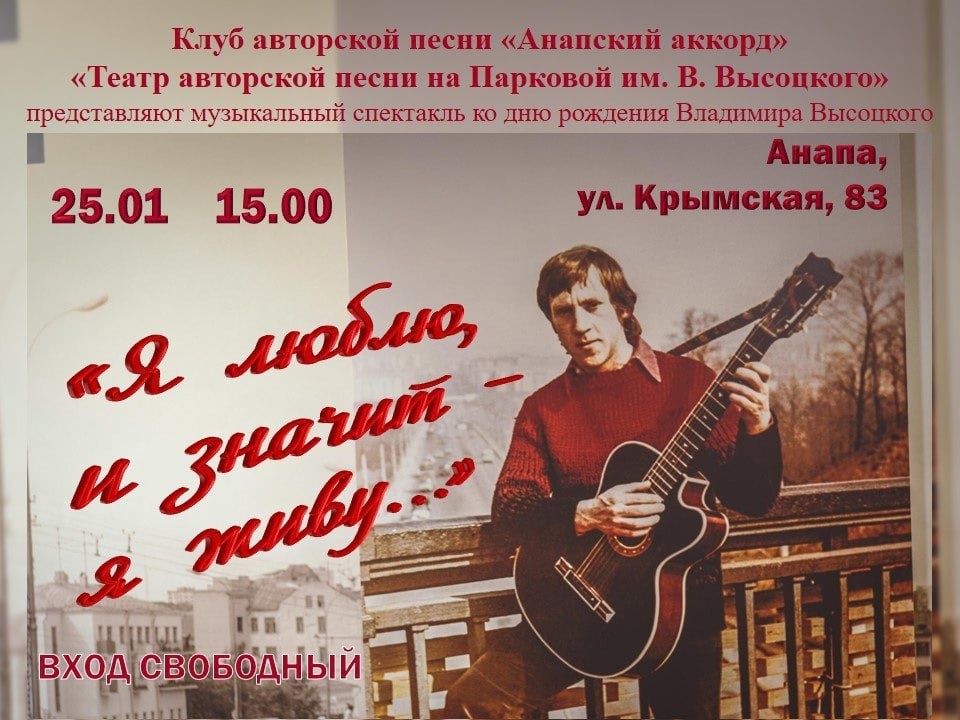 Клуб авторской песни "Анапский аккорд" совместно с "Театром авторской песни на Парковой им. В. Высоцкого" в честь дня рождения поэта и исполнителя Владимира Высоцкого приглашают всех желающих на музыкально-поэтическую программу, посвященную творчеству легендарного барда. Вас ждут любимые песни Высоцкого в исполнении талантливых артистов и поэтические произведения в авторском прочтении. 🗓25 января в 15.00 📍Детско-юношеская библиотека-филиал №1 имени В.И. Лихоносова, ул. Крымская, 83 Мероприятие проводится при поддержке Анапской централизованной библиотечной системы. Не пропустите возможность окунуться в мир поэзии и музыки Владимира Высоцкого! Новости Анапы в MAX