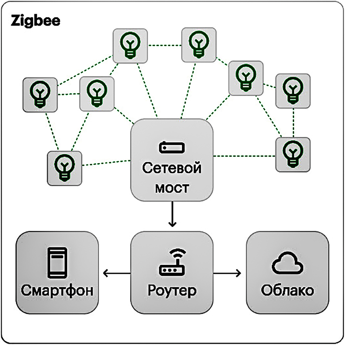 Zigbee. Это беспроводной протокол связи, в котором гаджеты объединяются в единую систему и могут обмениваться информацией друг с другом. Устройства, работающие по протоколу Zigbee, не могут подключаться к домашней сети Wi-Fi напрямую. Для их работы нужен любой совместимый хаб, например, хаб или колонка Яндекса. Низкое энергопотребление делает данный протокол наиболее подходящим для устройств длительного использования на батарейках. Кроме того, все устройства, которые не уходят в спящий режим, выполняют в этой системе роль дополнительных роутеров, ретранслирующих сигналы.