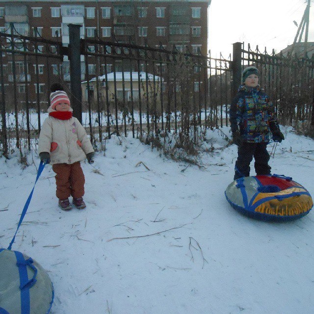 Зимой мы ещё жили в Дегтярске, маленький городок рядом с Екатеринбургом. Рядом с домом был стадион и стихийная горка, очень любили кататься на бубликах.