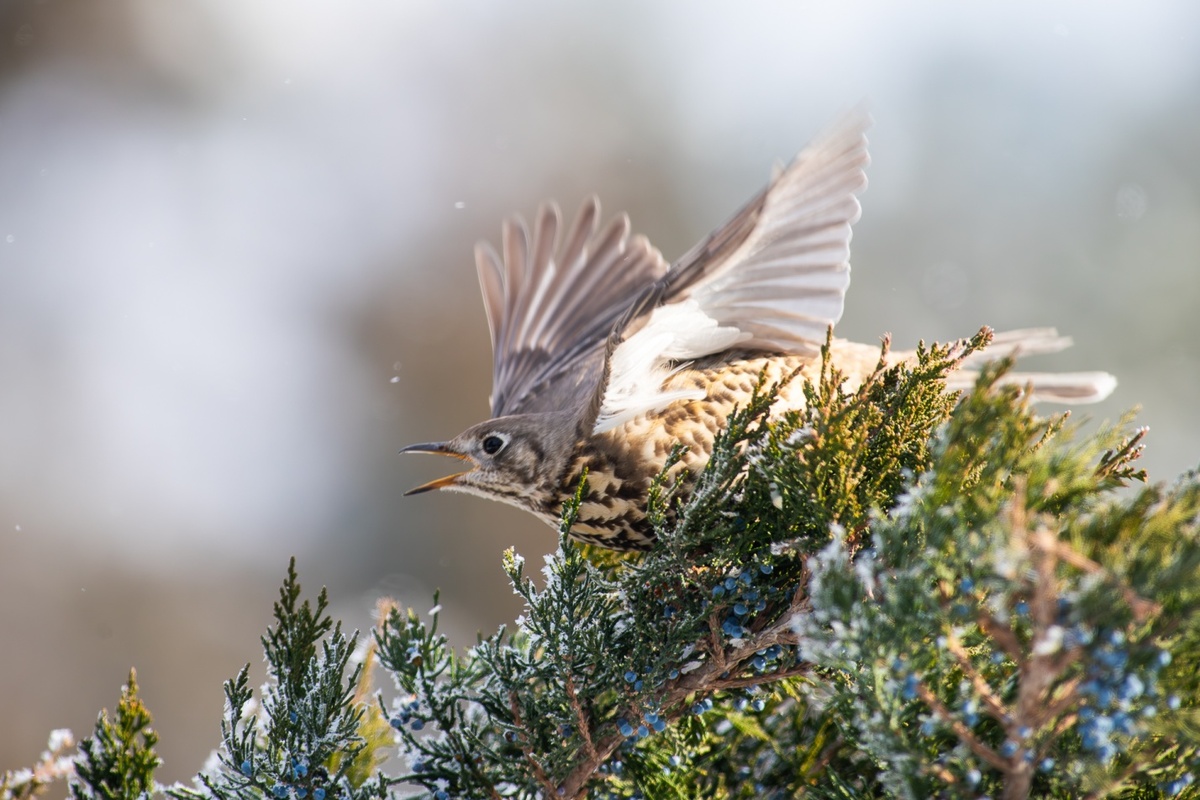 Многие еще помнят, что в советские времена была популярна такая песня, посвященная дроздам, и исполнял ее вокально-инструментальный ансамбль «Синяя птица», солист Сергей Дроздов. Вот и мы посвятим этот выпуск этому роду птиц, тем более что зимой сфотографировать этих осторожных пернатых несколько проще. Все снимки сделаны автором статьи. Дрозды, как подсказывает интернет, – род воробьиных птиц из семейства дроздовых. Всего к настоящим дроздам биологи относят 104 вида, большинство из них имеют размеры тела от 24 до 35 сантиметров, по земле передвигаются прыжками. В России встречаются около 30 видов дроздов. Питаются они в основном насекомыми и мелкими беспозвоночными, зимой переключаются на растительную пищу. Рябинник на кустах можжевельника В Астраханской области из дроздов, как считается, гнездится только рябинник. Это в принципе один из самых многочисленных видов, получивший свое название за любовь к ягодам рябины. В нашем регионе рябина встречается редко, только на дачных участках,
