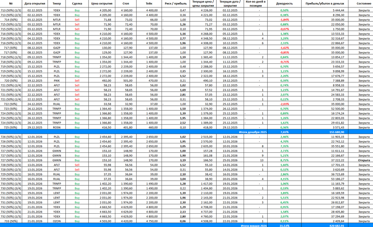 На этой неделе было всего 4 новые сделки и 2 с прошлой недели. Все закрыты в плюс, но к качеству исполнения есть вопросы. Котировки #TRNFP после пробоя 1400 руб. консолидировались над уровнем. Затем акции пробили локальную линию тренда в рамках коррекции в сторону восходящего тренда. Писал об этом здесь. Открыл позицию, 1/4 закрыл с соотношением риск/прибыль 1 к 1,3, перенёс стоп в безубыток на 1404,8 руб. На следующий день был резкий пролив почти до 1400 руб. с отскоком – там сработал стоп, перезайти не успел. В итоге акции Транснефти выросли почти до 1437 руб. Акции #LENT находятся в восходящем канале, были в числе лидеров прошлого года. На исторических максимумах акции Ленты ушли в 40-дневную проторговку. Купил в спекулятивный портфель на выходе из неё лимиткой по 2031 руб. с целью 2200 руб. Закрывал тремя частями, среднее соотношение риск к прибыли получилось 1 к 1,9. В итоге акции выросли до 2247 руб. – выше цели. Во вторник закрыл оставшуюся часть позиции в акциях #PLZL по 2635 р