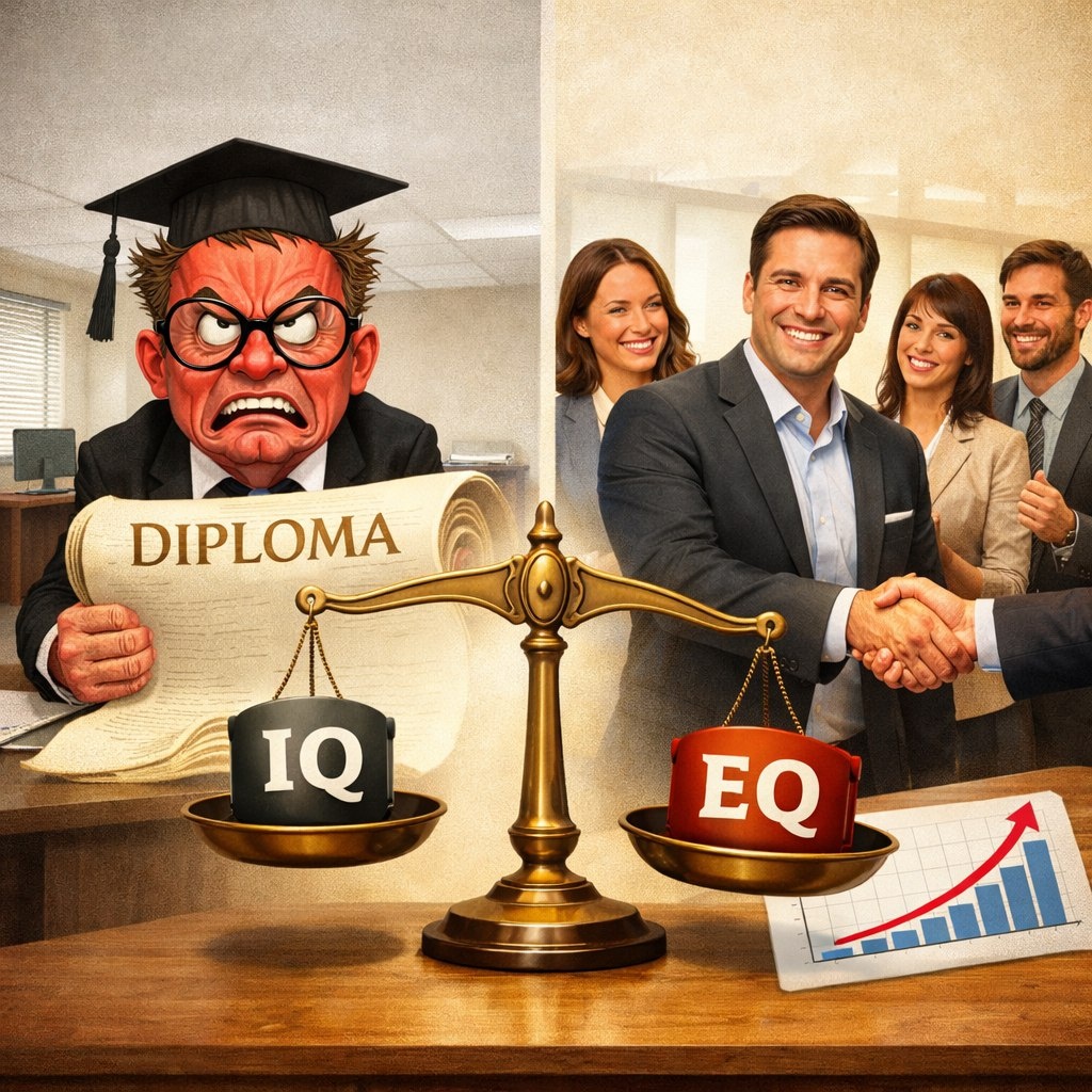 💡 Пример из жизни: Представьте двух менеджеров по продажам. Первый (высокий IQ, низкий EQ) с блеском проводит презентацию, но грубит клиенту, который задает «глупые» вопросы. Сделка сорвана. Второй (средний IQ, высокий EQ) может хуже знать продукт, но он чувствует сомнения клиента, задает уточняющие вопросы, снимает напряжение шуткой и создает атмосферу доверия. Результат — долгосрочный контракт. 🏆