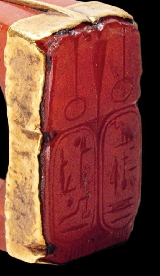 Кольцо выточенное из сердолика и обрамленное золотом с именами фараона Рамсеса II и царицы Нефертари, Новое царство, 19 династия, ок