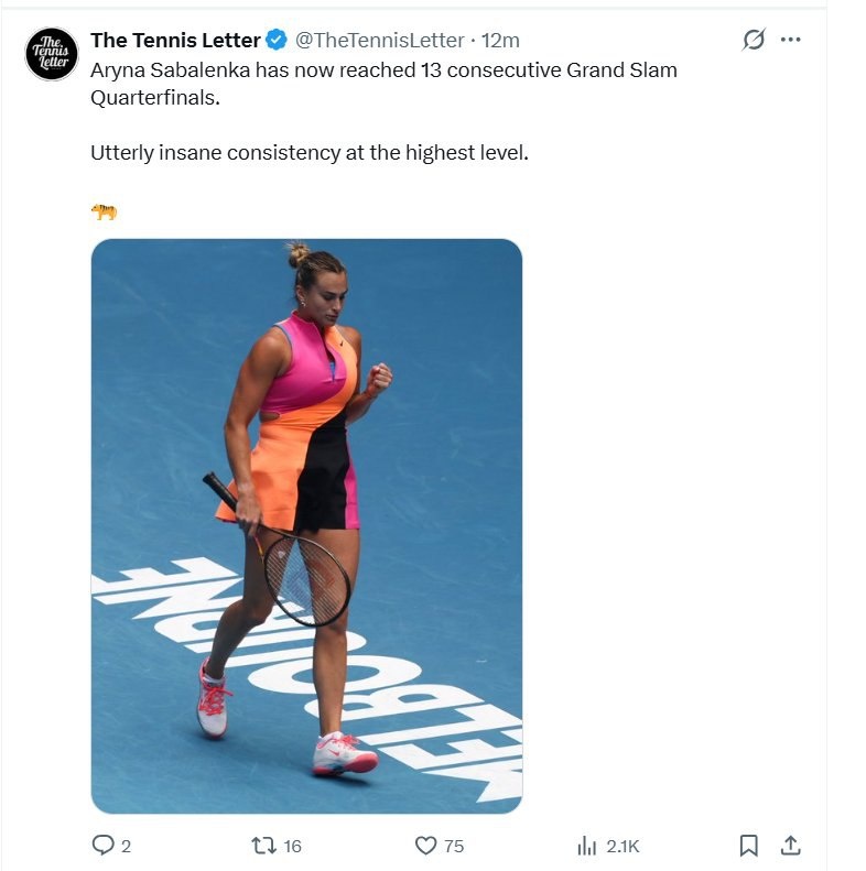 ⚡ Aryna Sabalenka вышла в 13-й подряд четвертьфинал турнира Большого шлема