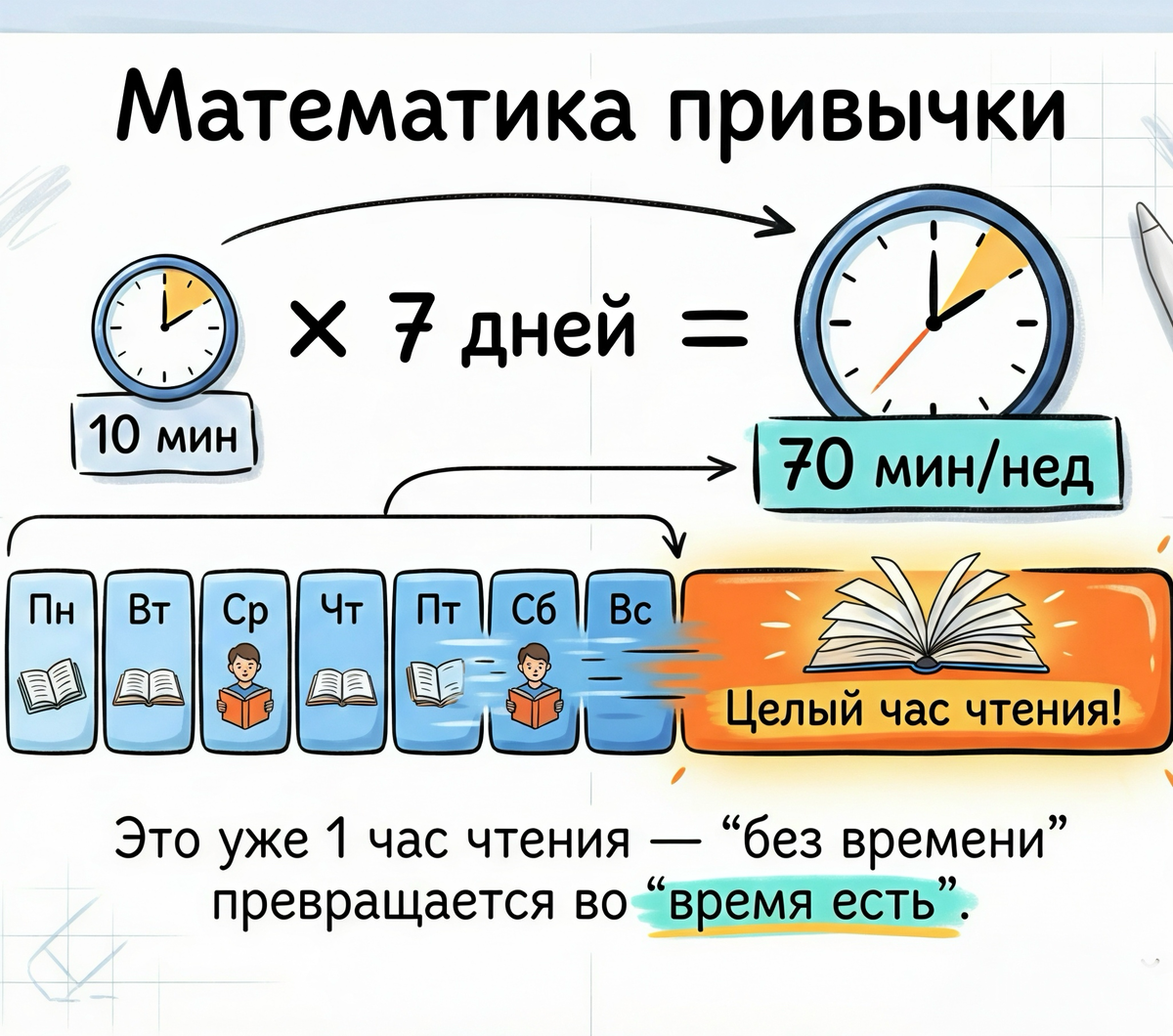 Как математика убивает последнюю отговорку Я всегда подозревал, что математика существует исключительно для порчи нервов школьникам. Выяснилось, что у неё есть и другое применение. Она разоблачает ложь, которую мы ежедневно рассказываем себе: "На чтение нет времени". Десять минут. Меньше, чем вы листаете ленту в ожидании кофе. Умножьте на семь дней. Получается 70 минут. Или, если угодно, час с хвостиком еженедельно. Арифметика простая, как совесть прокурора на пенсии. И столь же беспощадная. Превращение воды в вино Фокус в том, что десять минут не ощущаются временем. Это какая-то абстракция, зазор между делами, пустота в расписании. Но сложите семь таких пустот. И вдруг возникает субстанция. Материализуется целый час, который «невозможно было найти». Семьдесят минут в неделю. Почти три часа в месяц. Больше суток за год. На этом моменте математика из скучной науки превращается в обвинительный акт. Потому что выясняется: время было всегда. Просто мы виртуозно притворялись, что его нет. К