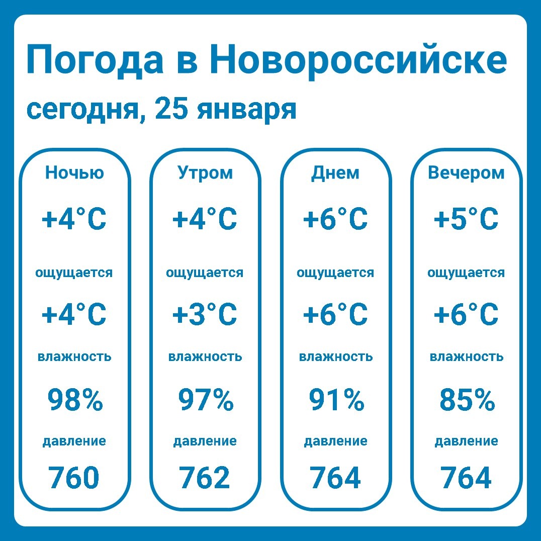 Погода в Новороссийске сегодня 25 января +4°C..+6°C, пасмурно, без осадков Ночью пасмурно, небольшой дождь, температура: +4°C, ощущается как: +4°C, вероятность осадков: 50%, ветер, западный: 2 м/с, влажность: 98%, давление: 760 мм рт. ст. Утром пасмурно, небольшой дождь, температура: +4°C, ощущается как: +3°C, вероятность осадков: 50%, ветер, северный: 3 м/с, влажность: 97%, давление: 762 мм рт. ст. Днем пасмурно, без осадков, температура: +6°C, ощущается как: +6°C, вероятность осадков: 20%, ветер, северный: 2 м/с, влажность: 91%, давление: 764 мм рт. ст. Вечером пасмурно, без осадков, температура: +5°C, ощущается как: +6°C, вероятность осадков: 20%, ветер, восточный: 1 м/с, влажность: 85%, давление: 764 мм рт. ст. Восход: 07:55 Закат: 17:27 Световой день: 09:32:05 Фаза луны: первая четверть ㅤ