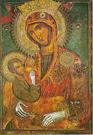 Перевод: Душ наших восприятие очистив, увидим на иконе таинство невероятное, Творца Вселенной и Господа высших сил, в объятиях Ты держишь и от груди Твоей как Младенца питаешь, и со страхом и радостью поклоняясь Тебе и родившемуся от Тебя Спасителю нашему, воззовем: «Радуйся, Владычица, жизни нашей Питательница».