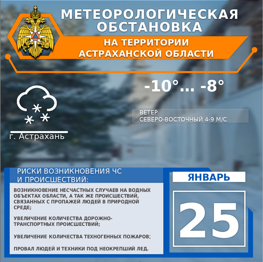 По г. Астрахань облачно. Снег. Ветер северо-восточный 4-9 м/с. Температура воздуха -10…-8°.