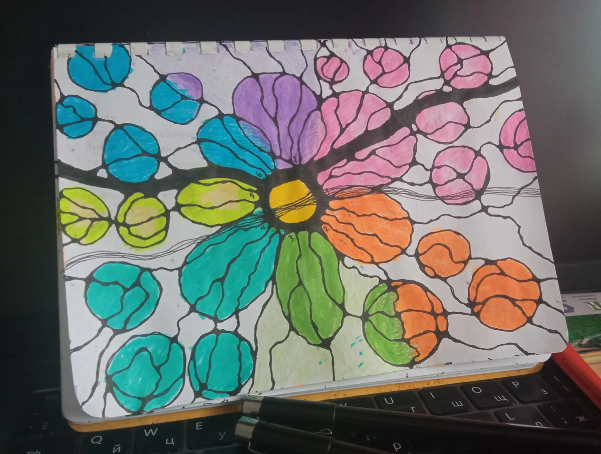 Рисунок чёрными маркерами, текстовыделителями и карандашами, техника «Цветик-семицветик», нейрографика 24/01/2026