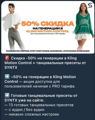 % Там SYNTX подхватили тренд и дают возможность поиграться с хайповым сейчас форматом создания аватаров или веселых видео через Kling Motion. По ссылке скидка 15% на подписки, у кого уже есть – промокод MGPRO даст на повторные покупки подписок и токенов. Обучалка по тому как делать танцульки у меня лежит в монтаже вторую неделю... скоро тренд стухнет, а я ее так и не выпустил. 😄