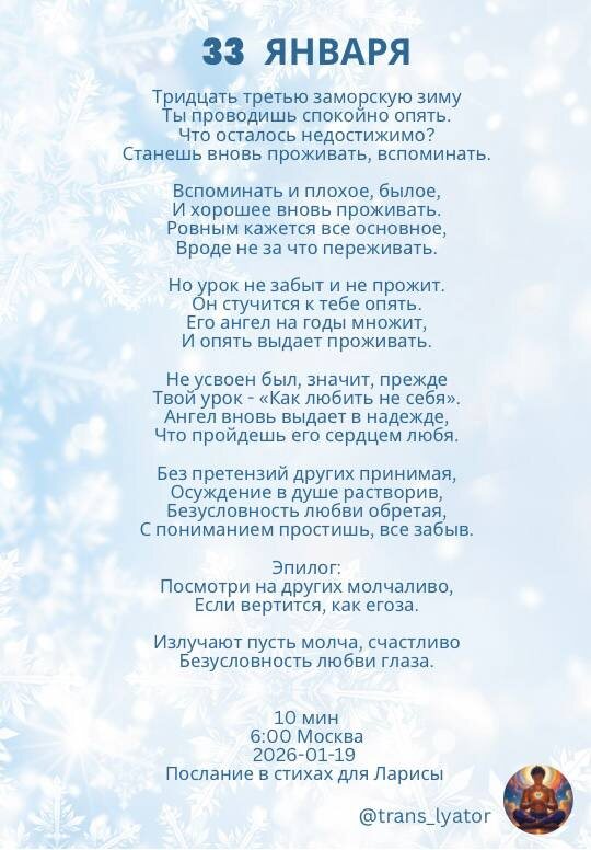 Либо стихи поздравления либо смысловые стихи-послания о вас для вас. Пример на фото. #подзаказ 33-е ЯНВАРЯ Тридцать третью заморскую зиму Ты проводишь спокойно опять. Что осталось недостижимо? Станешь вновь проживать, вспоминать. —- Вспоминать и плохое, былое, И хорошее вновь проживать. Ровным кажется все основное, Вроде не за что переживать. —- Но урок не забыт и не прожит. Он стучится к тебе опять. Его ангел на годы множит, И опять выдает проживать. —- Не усвоен был, значит, прежде Твой урок - «Как любить не себя». Ангел вновь выдает в надежде, Что пройдешь его сердцем любя. —- Без претензий других принимая, Осуждение в душе растворив, Безусловность любви обретая, С пониманием простишь, все забыв. —- Эпилог: Посмотри на других молчаливо, Если вертится, как егоза. Излучают пусть молча, счастливо Безусловность любви глаза. The end 10 мин 6:00 Москва 2026-01-19 Послание в стихах на заказ (от @Trans_lyator ) #подзаказ Как заказать стихи для себя, о себе, о близких - здесь: https://