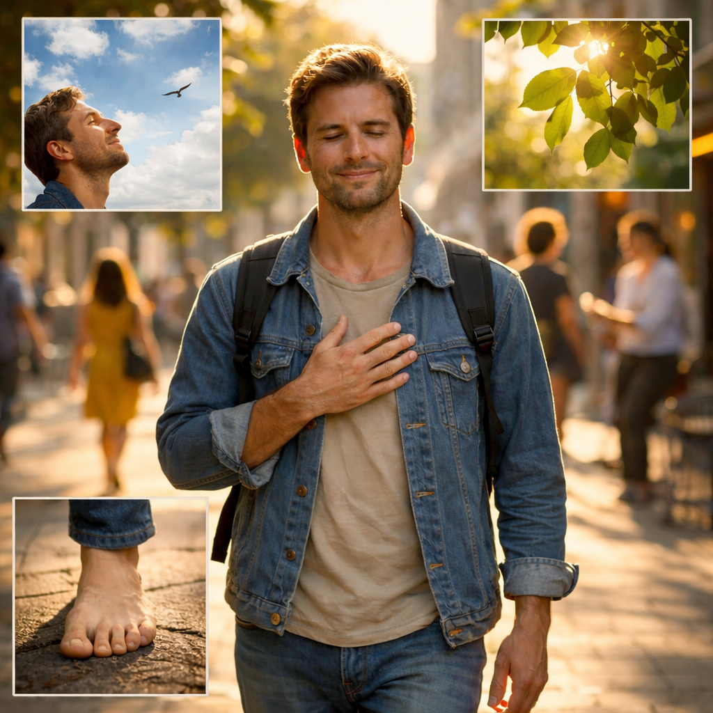 А теперь другой образ и та же улица. Но теперь человек чувствует, как ступни касаются земли, слышит шум города, замечает лица людей и ощущает своё дыхание. Он не «сосредоточен» специально — он просто присутствует. Мысли могут появляться, но они не "заслоняют" происходящее вокруг.