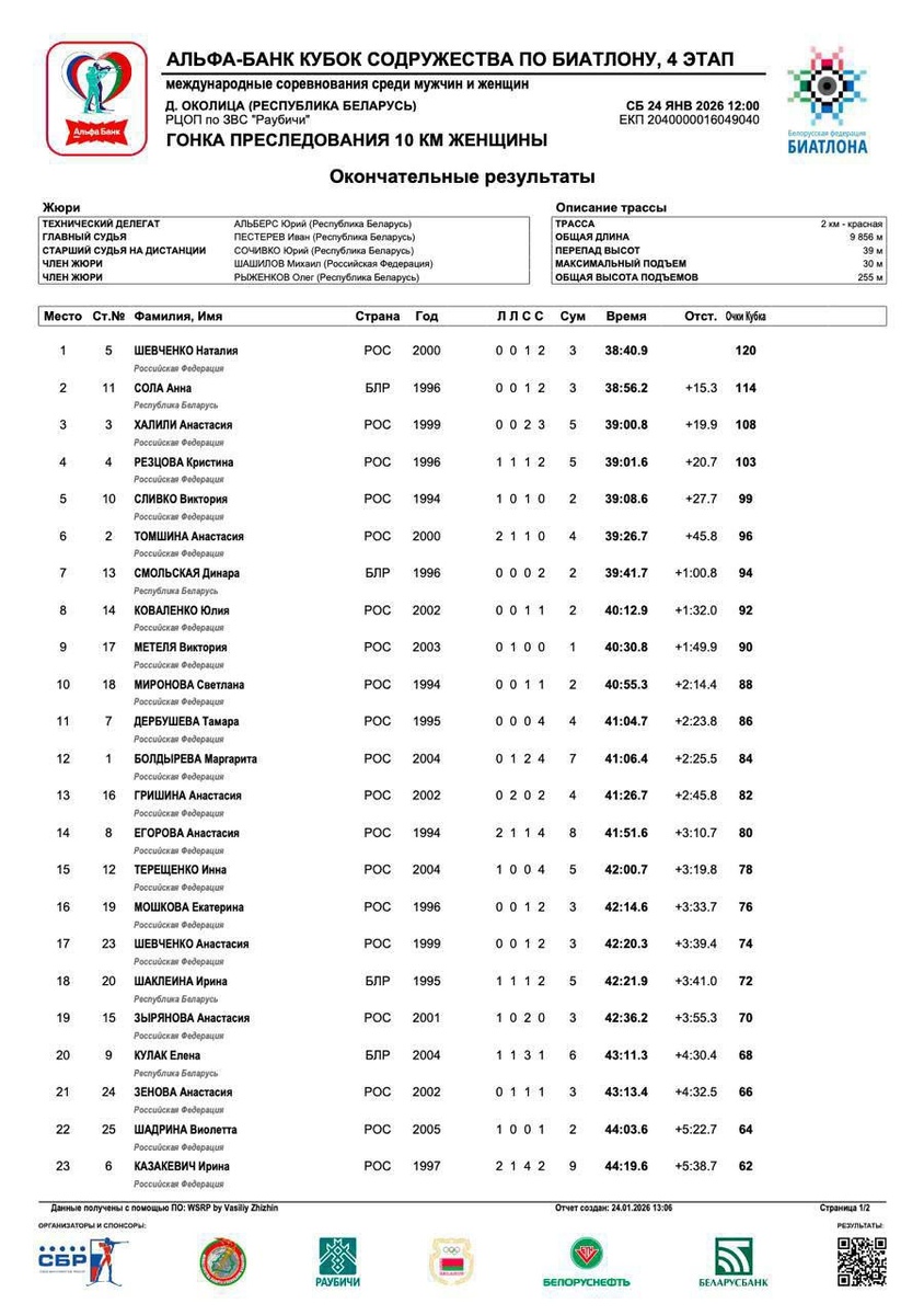 IV этап Раубичи Беларусь Гонка преследования Сударыни 1. Наталия Шевченко (Россия) - (3) 38.40.9 2. Анна Сола (Беларусь) – (3) +13.3 3. Анастасия Халили (Россия) – (5) +19.9 Результаты белорусок 7. Динара Смольская – (2) +1.00.8 18. Ирина Шаклеина – (5) +3.41.0 20. Елена Кулак – (6) +4.30.4 25. Виктория Шашкова – (4) +6.50.3 28. Ксения Воробей – (7) +7.25.6 31. Алина Зайцева – (2) +10.19.0