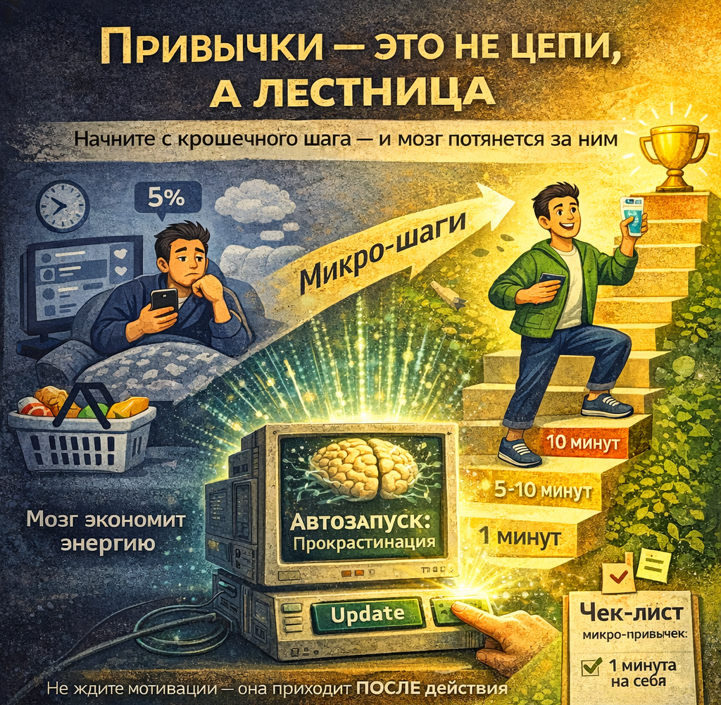 Привет, дорогой читатель! Давай поговорим о том, что мучает каждого из нас: почему мы прекрасно понимаем, как надо жить — но упорно делаем наоборот? Знакомо? Если это про вас — не спешите винить себя. Вы не «слабый» и не «безответственный». Всё дело в хитростях нашего мозга. И сейчас я объясню, почему так происходит. Нобелевский лауреат Дэниел Канеман (тот самый, который разбирается в психологии принятия решений лучше, чем вы в своём холодильнике) сформулировал жёсткую правду: мы не такие рациональные, как нам кажется. Наш мозг — как старый компьютер с автозапуском: он предпочитает привычные сценарии, даже если они: Почему? Потому что мозгу выгодно экономить энергию. А привычки — это «энергосберегающий режим». Шутка в тему: «Я знаю, что должен начать бегать по утрам. Но мой мозг говорит: „Давай сначала посмотрим 15 видео про то, как другие бегают. Для вдохновения!“» Вы можете прочитать 100 книг по саморазвитию, но если: то ваши знания превратятся в тяжёлый груз вины: «Я мог, но не сдел