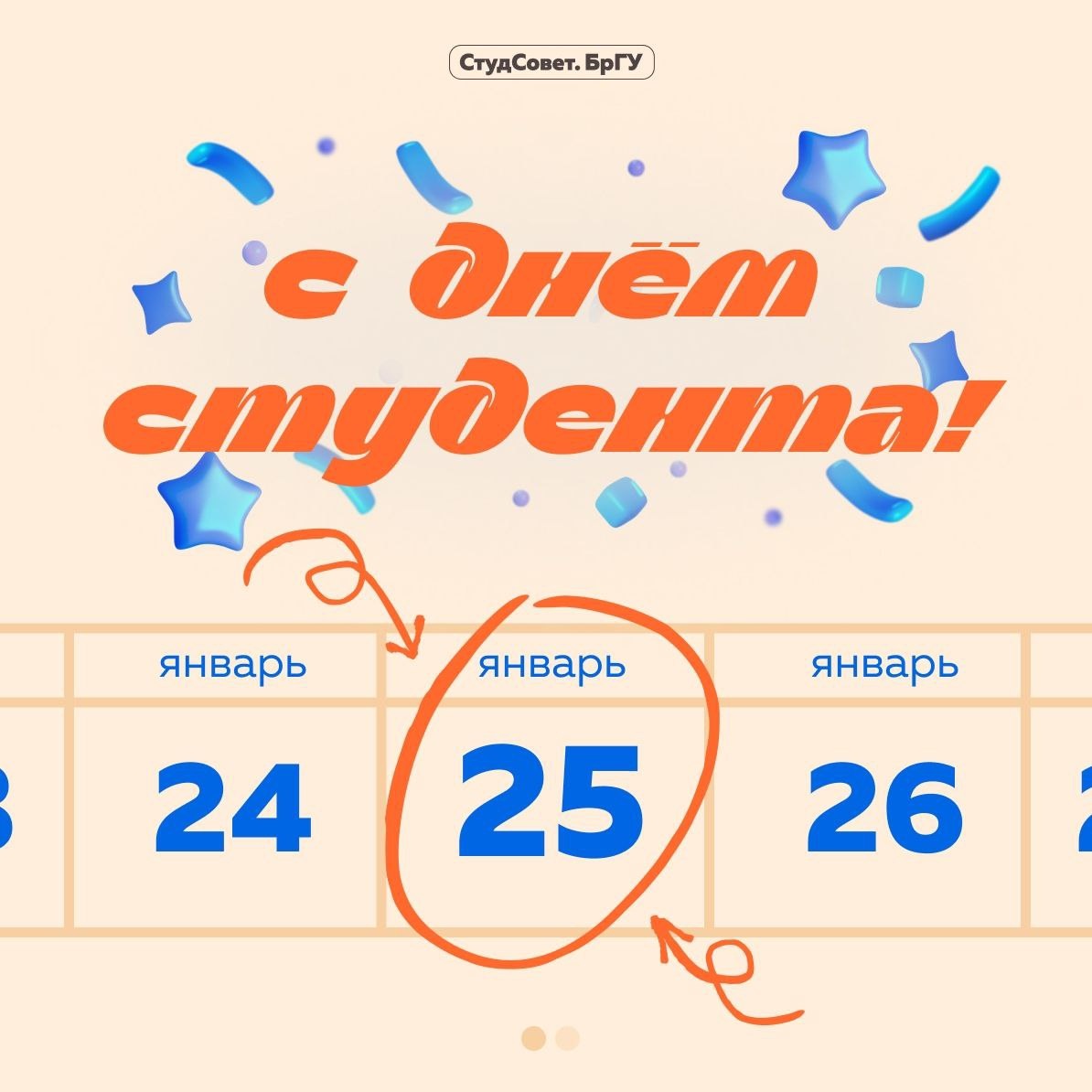 ! 🎓 Студенческий совет БрГУ от всей души поздравляет вас с Днём российского студенчества и Татьяниным днём — праздником всех, кто вступил на путь познания и профессионального становления! Студенческие годы — это уникальное время формирования будущих специалистов. Это период смелых проектов, научного поиска и обретения верных друзей-единомышленников. Ценен не только диплом, но и сам путь — полный открытий, свершений и личностного роста. Желаем вам, чтобы этот путь был вдохновляющим и плодотворным. Пусть каждая сессия становится ступенькой к успеху, а атмосфера университета наполняет вас энергией для новых идей и достижений. Пусть ваши студенческие годы станут прочным фундаментом счастливого будущего и оставят ярчайшие воспоминания. А чтобы было веселее — проходите наше праздничное бинго в карточке! ☝ С праздником! 🧡