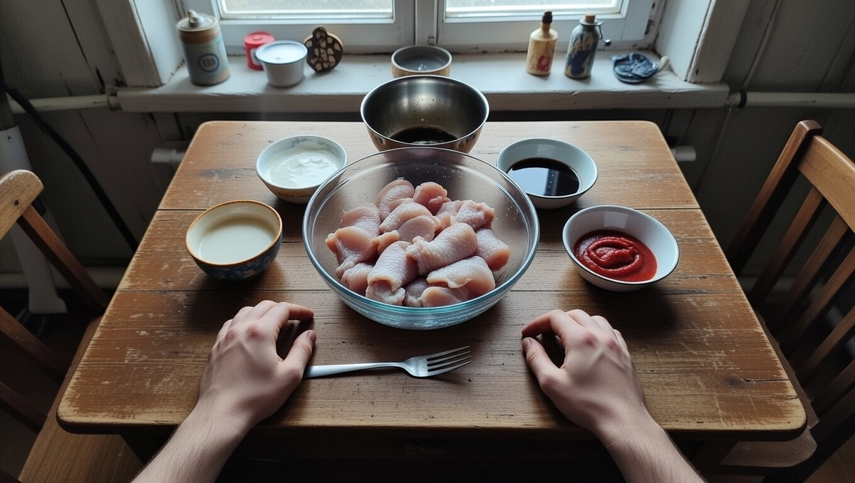 🛒 На столе: Базовое правило: Чтобы маринад сработал за 15-20 минут, я всегда делаю проколы вилкой или ножом в мясе. Так соус проникает внутрь волокон моментально, а не топчется снаружи. Идеально для филе, которое боитесь пересушить. Кислота кефира размягчает волокна. 📍В Дзене я расписываю химию процесса, чтобы вы понимали суть.