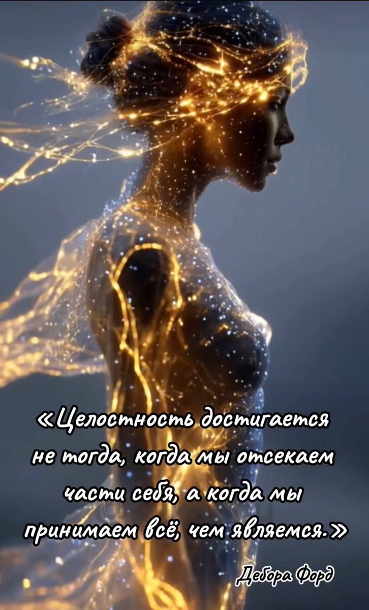 Но истинная целостность и сила рождаются из другого - из смелости принять всё, что есть внутри. Уставшего критика и напуганную девочку. Злость и нежность. Силу и уязвимость. «Успешную женщину» и ту, что хочет ничего не делать. Это не про оправдание всего, что мы делаем. Это про принятие. Про то, чтобы перестать вести внутреннюю борьбу и собрать себя воедино. Предлагаю вам воскресный вопрос: Какую часть себя вам труднее всего принять? И что могло бы измениться, если бы вы перестали с ней бороться? Спокойного и принимающего вам воскресенья 🕊️ P.S. Тема цитаты навеяна вчерашней сессией с чудесной женщиной - моей клиенткой 🤍