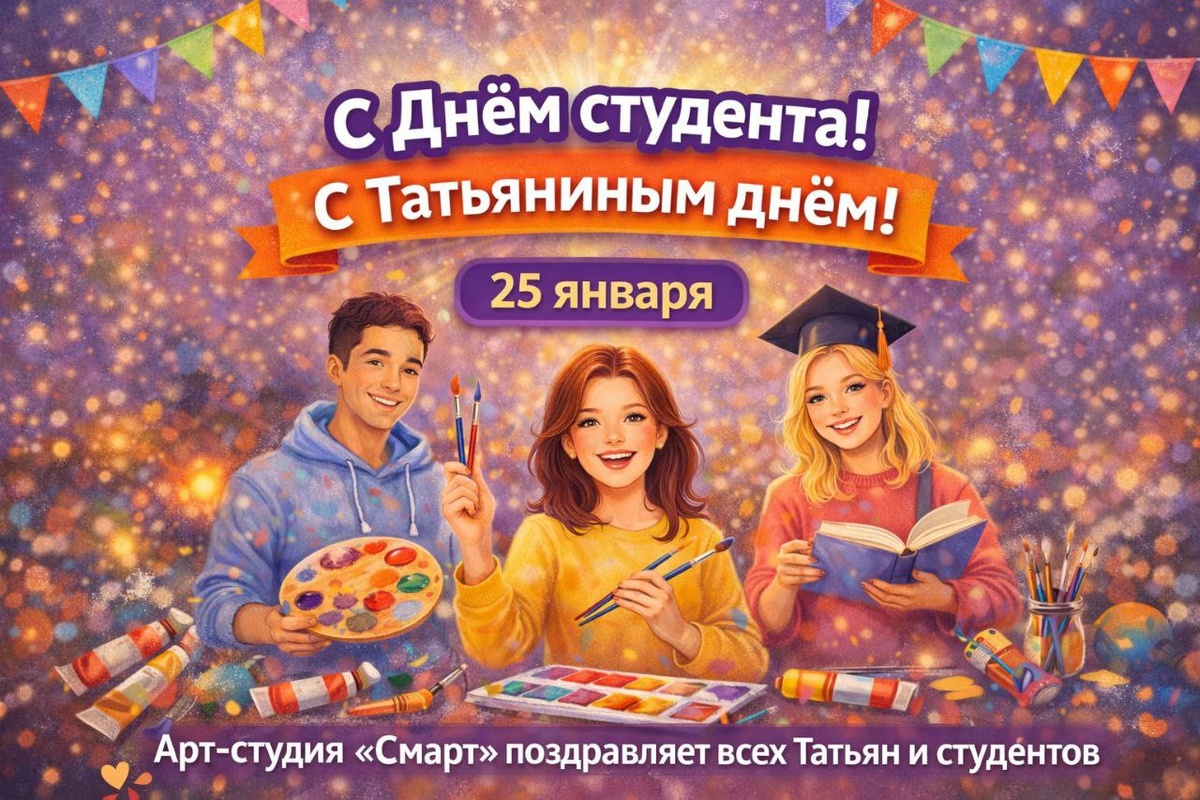 ! ✨🎓 Арт-студия «Смарт» от всей души поздравляет вас с Днём студента и Татьяниным днём! 💛 Пусть годы учёбы будут яркими, вдохновляющими и наполненными творчеством, новыми открытиями и радостными моментами. Желаем лёгких экзаменов, смелых идей, веры в себя и вдохновения каждый день 🎨 Пусть искусство помогает вам мечтать, создавать и находить гармонию в любом деле! С теплом и лучшими пожеланиями, ваши арт-студия «Смарт» во главе с директором Татьяной 😘✨