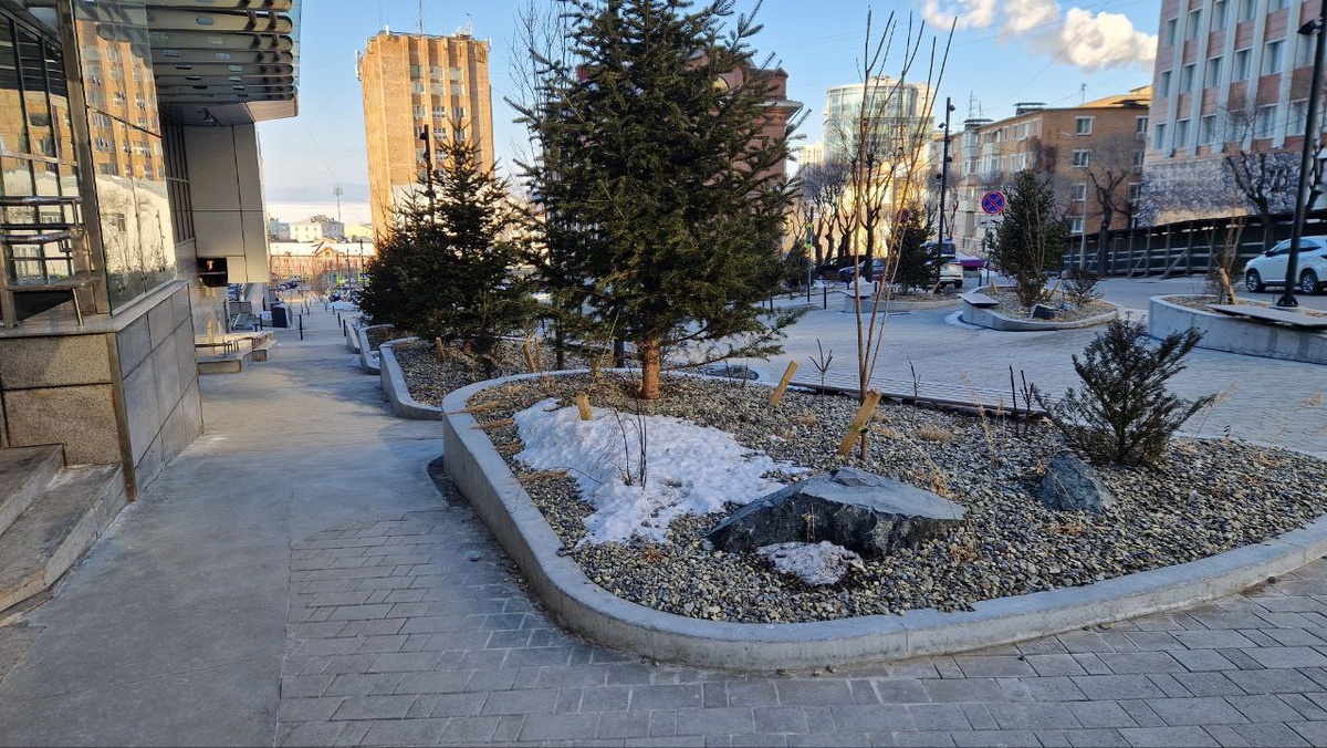 Восторженные публикации тут и тут. Она была ужасной, а стала странной и это конечно большое достижение. Газоны с кустами и деревьями - это прекрасно, мощение брусчаткой - здорово, хвоя и природный камень - великолепно, бетонные вазоны для создания горизонтальных поверхностей на наклонной улицы - вообще чудесно. Но, черт побери, можно было сделать гораздо больше парковочных мест, столь дефицитных в центре, путем некоторого сокращение ширины тротуара и газонов. Ну а металлическое ограждение у кустиков и вовсе выглядит как "освоение", ведь тут его защищать от проникновения не нужно - проникать некуда. Данный проект - это иллюстрация негативных последствий доминирования или монополии на рынке. В данном случае в области благоустройства.