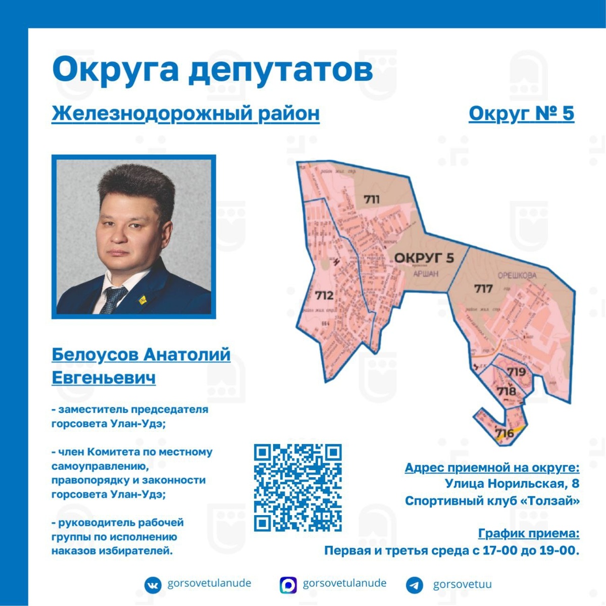 🔷️Избирательный округ №5 🔹️Округ №5, как и округ №1, расположился в северной части Железнодорожного района Улан-Удэ, но чуть западнее. В состав округа входят микрорайоны Аршан и Орешкова, с округом № 1 они делят территорию Лысой горы. 🔹️Депутатом округа является Анатолий Евгеньевич Белоусов, заместитель председателя Улан-Удэнского городского Совета депутатов, член Комитета по местному самоуправлению, а также руководитель рабочей группы по исполнению наказов избирателей. 🔹️В работе на округе акцент делается в первую очередь на жилищно-коммунальном хозяйстве, так как территорию занимают преимущественно частные дома и частично благоустроенные двухэтажные дома. 📍Адрес приемной на округе: Улица Норильская, 8 Спортивный клуб «Толзай» 🗓График приема: Первая, третья среда с 17-00 до 19-00 (каждую среду прием ведет помощник депутата). 🔎 Подробнее о том, какие улицы, переулки и товарищества входят в границы округа №5 – в нашем канале в МАХ 👉 https://max.ru/gorsovetulanude/AZvzv99D