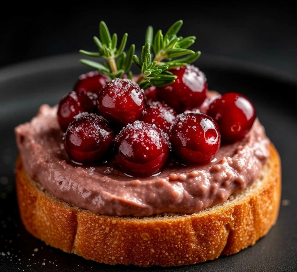 ИНГРЕДИЕНТЫ (на 2 порции): 🧾 ·Баттард или багет — 4 ломтика (толщиной 1,5 см) 🥖 ·Готовый печёночный паштет (из магазина или домашний) — 100 г ·Клюква замороженная или свежая — 2 ст.л. 🍒 ·Сахар — 1 ст.л. (для клюквы) ·Свежий тимьян — несколько веточек (или щепотка сушёного) 🌿 ·Сливочное масло — для жарки.