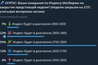 : 1️⃣ Опрос про ожидания по Индексу Мосбиржи! Неделю закрыли на уровне 2787, сделав за неделю +50 пунктов! 55% - ВАНГИ! Это большинство! 22% ожидали рынок в диапазоне 2800-2900. 12% ждали рынок в диапазон 2600-2700. Мощнейшее снижение пессимизма по отношению к прошлой неделе! 2️⃣Опрос по паре юань-рубль! Юань-рубль закрылся на уровне 10,8550, сделав за неделю -2,81%. 39% голосовавших - Ванги! 40% ожидали боковик 11,13-11,36! 7% голосовали за диапазон 11,36-11,50. Здесь продолжается рост нисходящих ожиданий! 3️⃣ Опрос о будущей трехсторонней встрече Опрос всё еще открыт. На данный момент 47% считают, что идет затягивание времени, результатов не будет. 42% считают, что смогут достичь каких-то результатов постоянными встречами. 🚗 МОЛОДЦЫ! Проведем несколько опросов с ожиданиями на следующую неделю! #опрос #bogdanoffinvest
