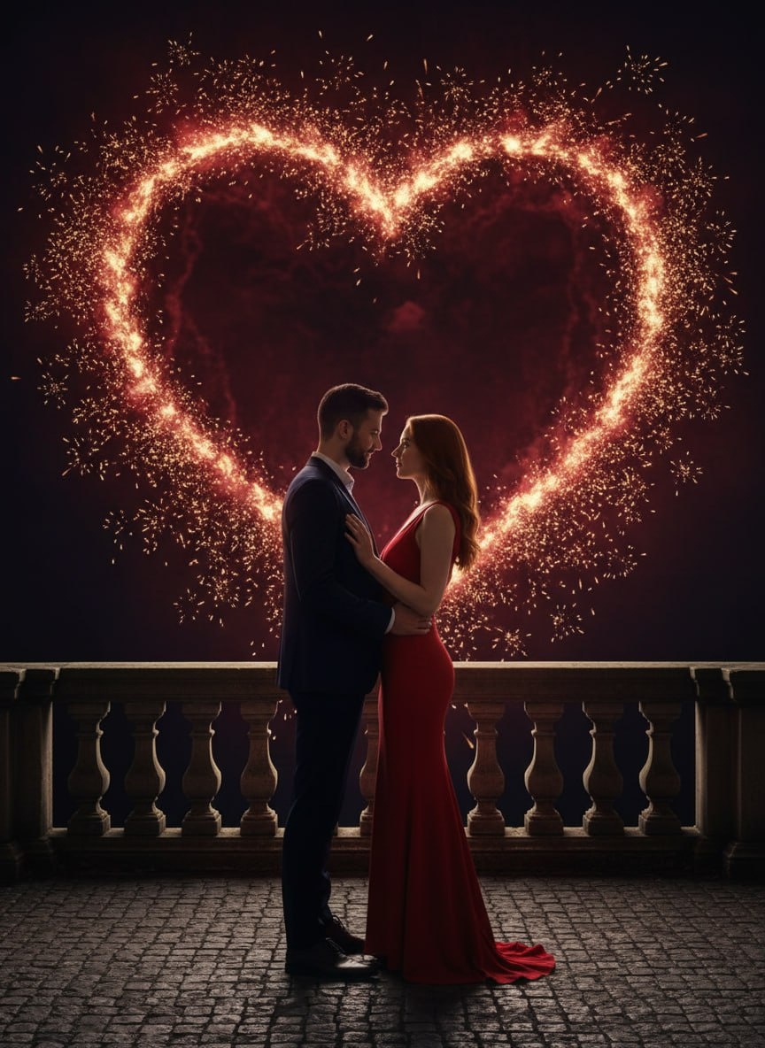 — Переходи в бот - https://t.me/picture_aibot?start=-nano (PRO версия работает лучше) — Загружай фото и вставляй промт одним сообщением Промт: Используй двух персонажей с загруженного изображения, сохранить естественные черты лица, пропорции и возраст без стилизации. Создай кинематографическую ночную романтическую сцену. Мужчина и женщина стоят очень близко друг к другу на каменном балконе или террасе исторического здания, мужчина держит женщину за талию, между ними напряжённый зрительный контакт. Композиция интимная, центрированная, ощущение кульминационного момента. На заднем плане — крупный салют в форме сердца, чётко читаемый симметричный силуэт, насыщенный красный цвет с мягкими золотыми искрами по краям. Лёгкий дым подчёркивает форму сердца и создаёт светящееся ореольное свечение вокруг него. Салют занимает центральную часть ночного неба и визуально обрамляет пару. Женщина одета в элегантное красное вечернее платье, подчёркивающее фигуру. Мужчина — в тёмном классическом костюме.