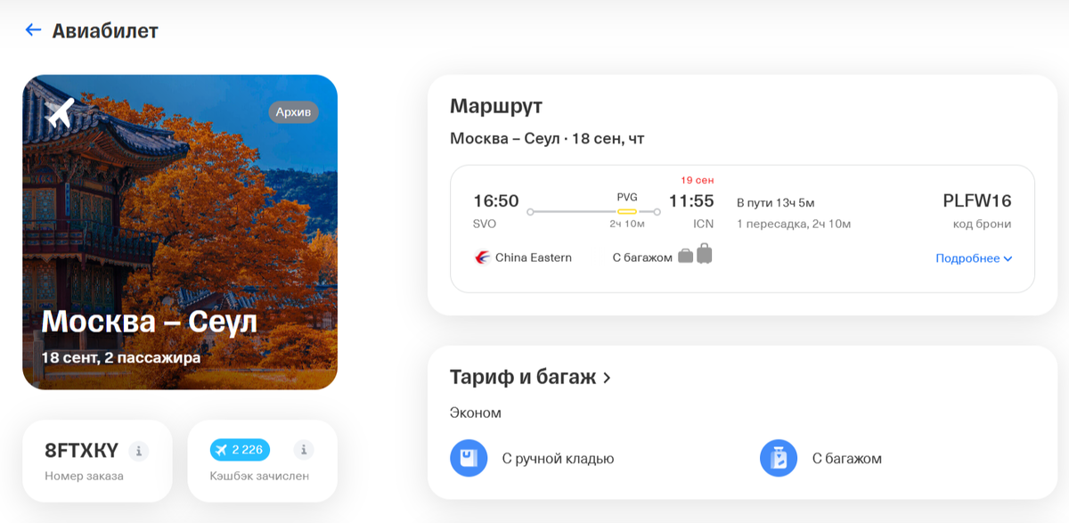 Билеты мы покупали в обратном порядке: то есть ехали мы сначала в Корею, потом во Вьетнам и в конце в Таиланд. Но первые билеты купили из Бангкока в Санкт-Петербург, где мы постоянно проживаем. И уже после этого 23 августа купили билеты на самолет: Москва - Сеул на 18 сентября, и следом уже быстро придумали маршрут передвижений в другие города и страны. Так вот как-то спонтанно, но очень удачно, мы не заблаговременно, но выгодно смогли купить билеты через Т-Путешествия за 22 271,00 ₽ на одного, с двухчасовой пересадкой в Шанхае.