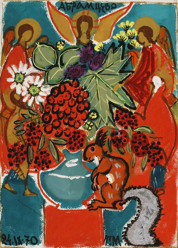 Посмотрите на её понимание Троицы. То, как она вписала образ, созданный Андреем Рублёвым в общую композицию, да ещё и само название, «Белка песенки поёт», может свидетельствовать о глубокой, неразрывной и тайной связи между иконописью и народным искусством. Вот что писал о Татьяне Алексеевне Ефим Дорош – «… когда я любуюсь яркими, живо и точно сработанными картинками Мавриной … художница, по разумению моему, всей сутью своею мастерам этим родная сестра». Мастерам древнерусским, именно их имеет в виду Ефим Дорош. И он же продолжает: У неё тот же, что у них, светлый и озорной, Уверенный в себе и живущий в ладу с жизнью лёгкий, весёлый талант. Взгляните на одну из иллюстраций художницы к сказке А. С. Пушкина «Руслан и Людмила» - яркую иллюстрацию вышесказанного. #Маврина