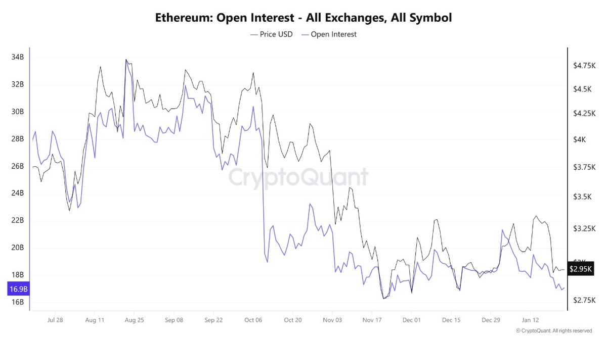 Цена: $2,958 (+0.33% ↗️) На фоне диапазонного движения цены Ethereum, наблюдается значительное снижение открытого интереса (OI) на большинстве бирж до $16.9 млрд, что является самым низким показателем с середины декабря прошлого года. Это свидетельствует об уменьшении аппетита к риску на рынке деривативов Ethereum. Однако, Binance демонстрирует аномальное поведение, поддерживая высокий уровень OI около $7.5 млрд, что даже выше средних значений декабря. Это указывает на переток ликвидности в более надёжные и ликвидные площадки. 📊 Ключевые моменты: - Сокращение спекулятивной активности снижает риски ликвидации и способствует консолидации цены Ethereum. - Крупные трейдеры не уходят с рынка, а лишь снижают риски, перераспределяя позиции на Binance. - Удержание Binance OI на уровне выше декабрьских минимумов подтверждает наличие сильной поддержки со стороны рынка деривативов.