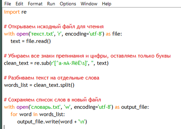 * import re # Открываем исходный файл для чтения with open('текст.txt', 'r', encoding='utf-8') as file: text = file.read() # Убираем все