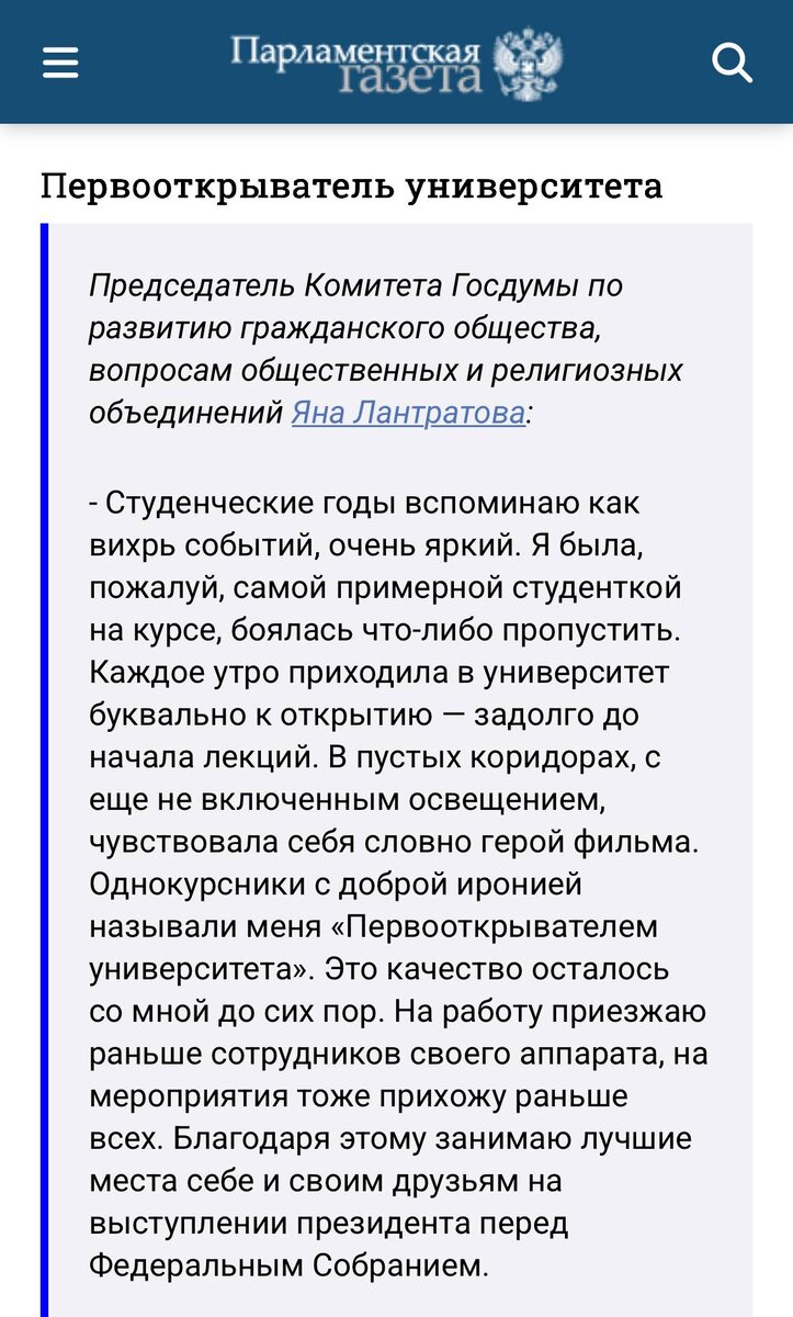Я была, пожалуй, самой примерной студенткой на курсе, боялась что-либо пропустить. Каждое утро приходила в университет буквально к открытию — задолго до начала лекций. В пустых коридорах, с еще не включенным освещением, чувствовала себя словно герой фильма. Однокурсники с доброй иронией называли меня «Первооткрывателем университета». Это качество осталось со мной до сих пор. На работу приезжаю раньше сотрудников своего аппарата, на мероприятия тоже прихожу раньше всех. Благодаря этому занимаю лучшие места себе и своим друзьям на выступлении президента перед Федеральным Собранием. В студенческие годы свободного времени у меня практически не было. Как раз в тот период зародилось наше добровольческое движение, и я была одним из его основателей. Это было настолько захватывающим! Мы начинали с небольших акций помощи детям в детских домах, местным пенсионерам и малоимущим семьям. Помню, как уговаривала однокурсников присоединиться, как мы вместе учились организовывать эти акции, находить с