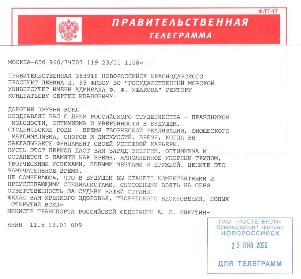 В адрес ректора Ушаковки Сергея Кондратьева пришла правительственная телеграмма🎉🔥👍🌟