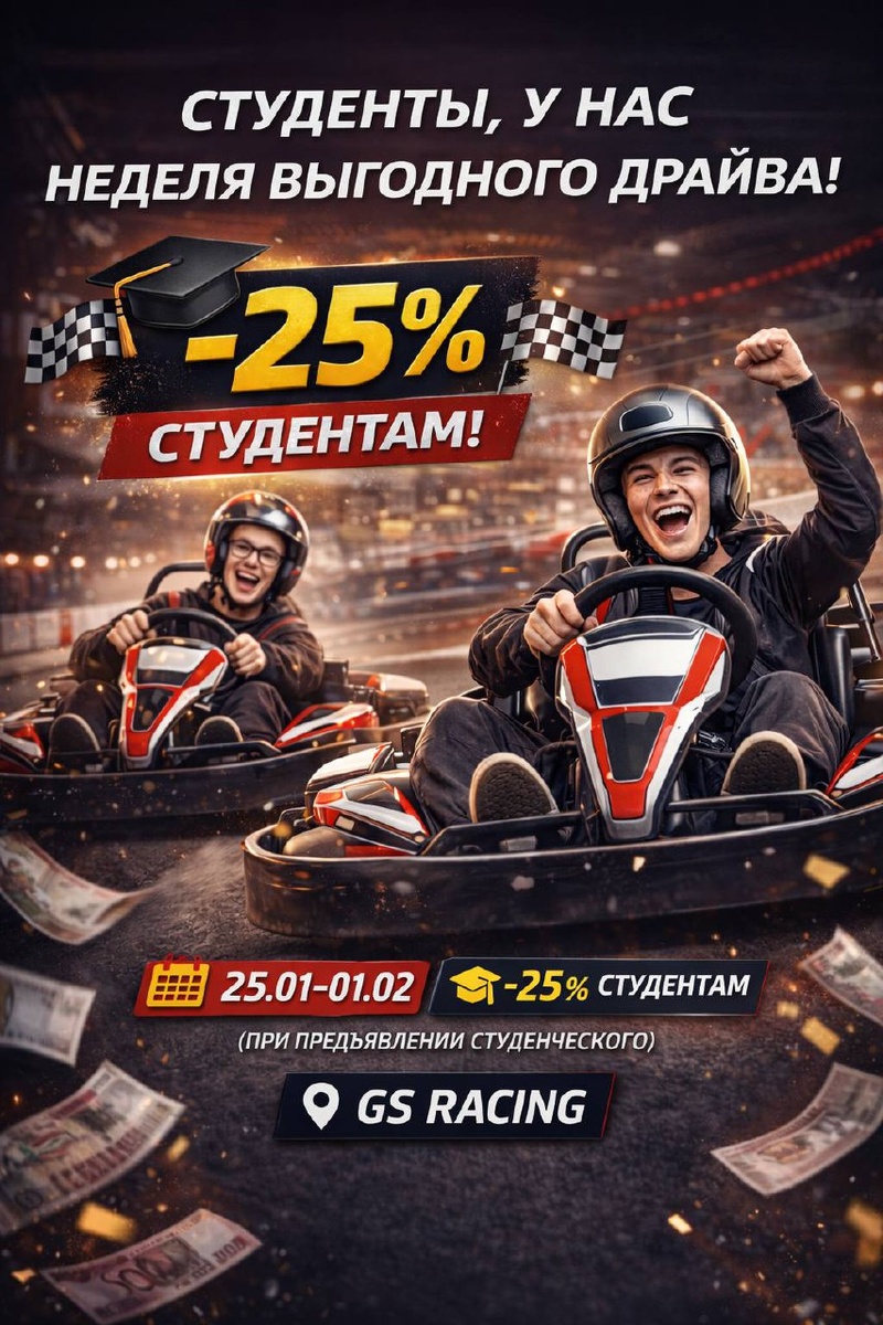 🏁🔥 С 25.01 по 01.02 действует скидка 25% на прокат в картодроме GS Racing! Берите друзей, собирайте свою команду и приезжайте гонять — сессия будет жаркой 😄 📅 25.01–01.02 🎓 -25% студентам (при предъявлении студенческого)* 📍 GS Racing *Не суммируется с другими акциями картодрома