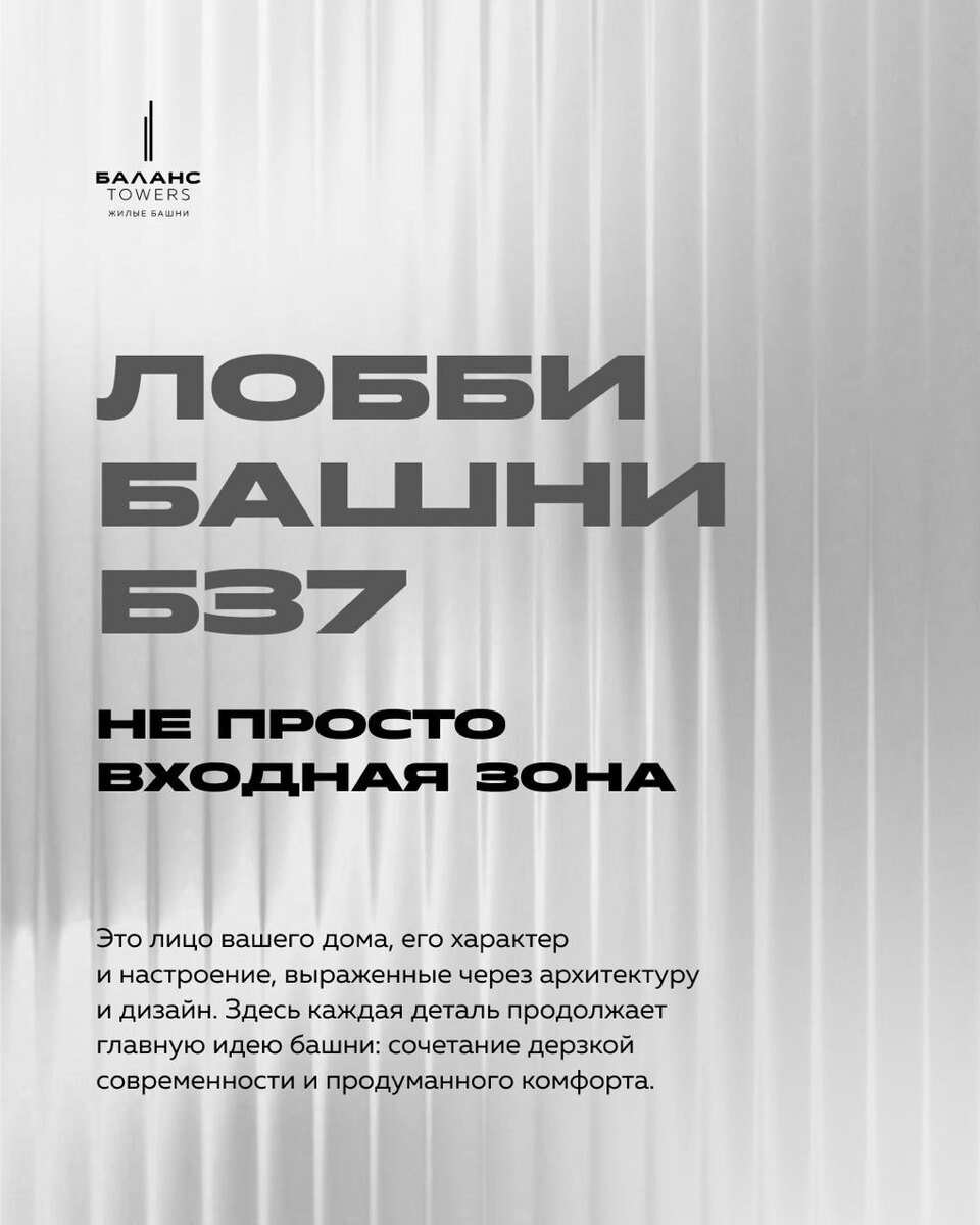 И даже понять, какие люди живут в доме. При создании дизайна лобби башни Б37 архитекторы уделили особое внимание деталям, чтобы создать комфортную и функциональную атмосферу. Где будет удобно провести и бизнес-встречу, и пообщаться с соседями. Такой подход сделает лобби значимой социо-культурной частью повседневной жизни резидентов «Баланс Towers». «Мы выбрали металл основным материалом для стен входной зоны. Отражающая поверхность стальных листов резонирует с динамикой башни. А экраны помогают создавать разную атмосферу — от деловой до расслабленной», — комментирует Юлия Вишнякова, автор концепции лобби «Баланс Towers».